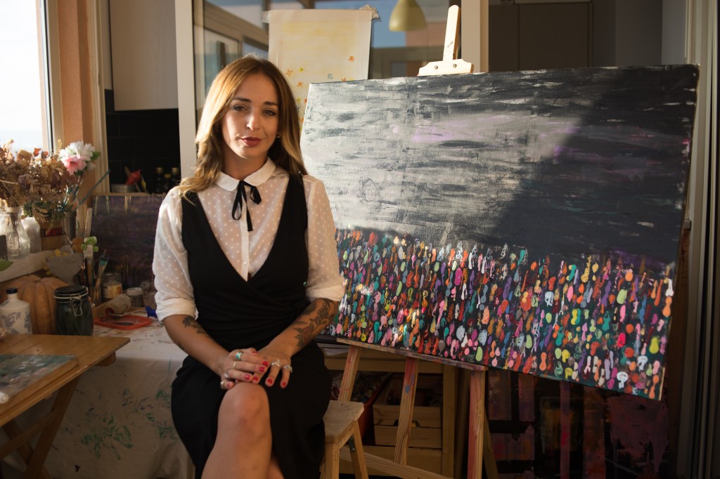 e organica (come l’uso del caffè, in particolare durante le sue sessioni notturne), Alice dà vita a dipinti che ci trasportano in un universo dove l’intuizione
